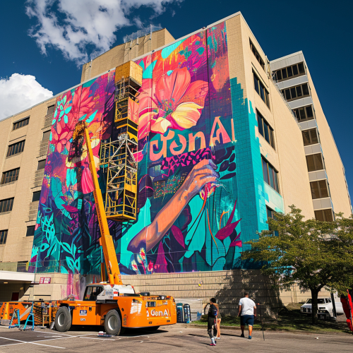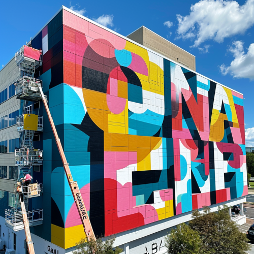 painted 3D logo text "GenAI", colorful mural being painted by artists on the side of a large building with the text "GenAI" --v 6.0
