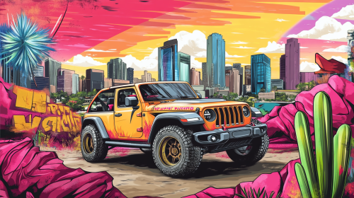 A mural design of an illustrated jeep gladiator and Audi r8, It features vibrant colors, Arizona desert theme, cacti, Gilbert cityscape, Italian flag, colorful patterns, comic book style, and pink accents. The overall theme is festive and fun, capturing iconic elements of Arizonaa culture and travel. Mural vector graphic --ar 16:9