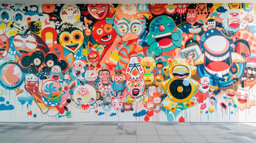 a large japanese style colorful mural on a white wall with murakami style elements and fun happy smiling robots eating ramen --ar 16:9