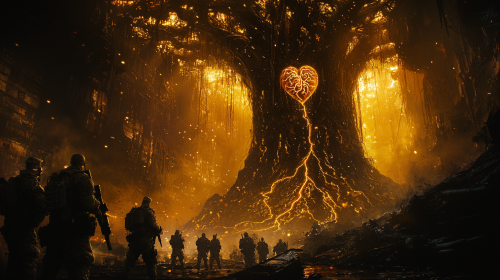 In the massive, charred cargo hold of a burned-out freighter, a terrifying black tree stands tall. The tree's trunk is covered in golden vines, with a giant human heart connected by arteries to the trunk. A group of fully armed Marines, wielding rifles, stands nearby. The atmosphere is dark and ominous, captured with Rembrandt-style cinematic lighting, as if shot on an ARRI camera, creating an intense horror movie vibe --ar 16:9 --s 250 --q 2 --seed 594234596