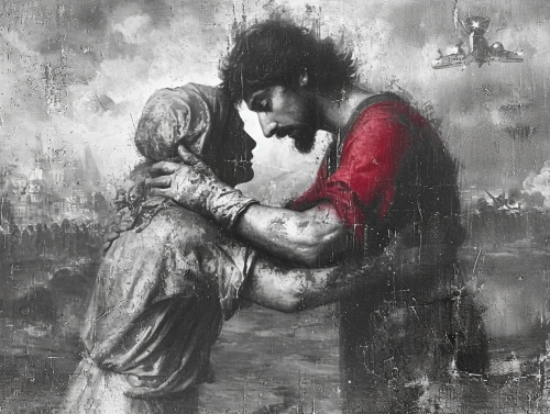 Jesus Christ healing Super Mario. Mario is badly hurt in war. Jesus Christ has his hand on Mario's shoulder and looks very loving. The surrounding atmosphere is full of war. The image is in black and white, but the small area around Jesus and Mario is in color. --ar 4:3 --style raw --w 2000 --v 6.0
