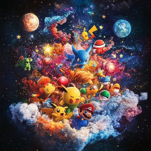 les Mignons du film Moi Moche et Méchant avec les Pokémon et Mario dans l'univers avec des planètes et la galaxie en arrière plan, des nuages de fumée colorés des étoiles filantes sur fond noir