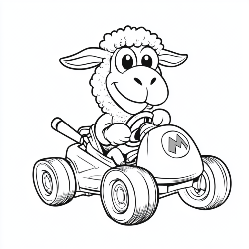 disney cartoon style, happy friendly sheep with four legs is driving in a mario kart against princess peach, standing sideways but looking into the camera, white background and black and white, for coloring