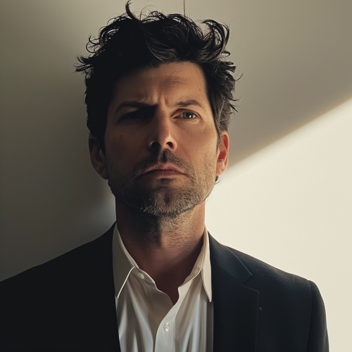 From Severance. Mark Scout (Adam Scott) in a close-up shot, looking straight ahead against a blank white wall. The top of his black suit jacket and white button-down shirt are visible. He wears a miserable expression. --v 6.0
