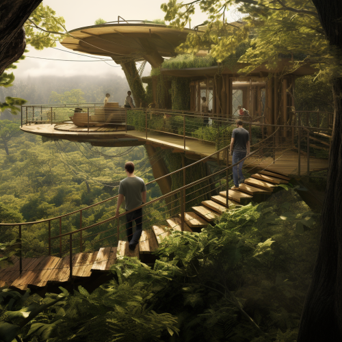 a photo realistic image from far away of Mark Zuckerberg in a large modern treehouse in the jungle