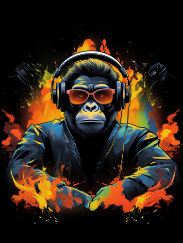 A graphic t-shirt design of a confident ape DJ wearing sunglasses and headphones, surrounded by turntables and a crowd of enthusiastic fans. The design captures the musicality and coolness of hip hop, merged with the strength and energy of an ape. Black background. --ar 3:4 --v 5.2