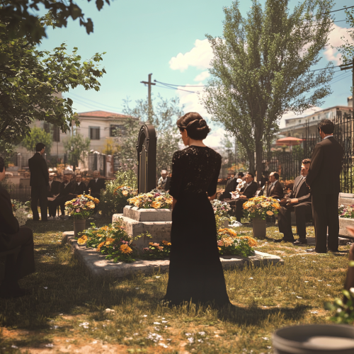 1970's outdoor funeral scene, with a woman in a black funeral dress standing at the head of a grave site, there are people sitting and standing around the funeral site but not near her. The style of the attire they all wear is 1970's Mafia, like from The GodFather 2 movie. Make the image photo realistic as it is a still taken from a famous Martin Scorsese film.
