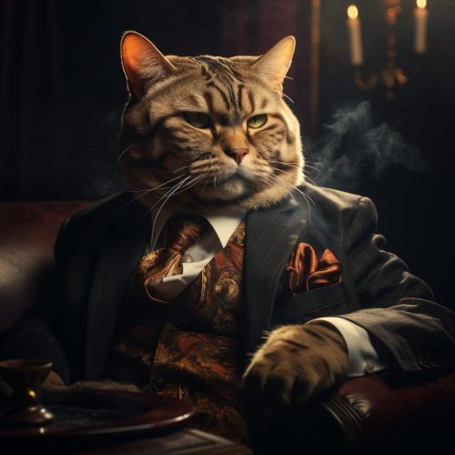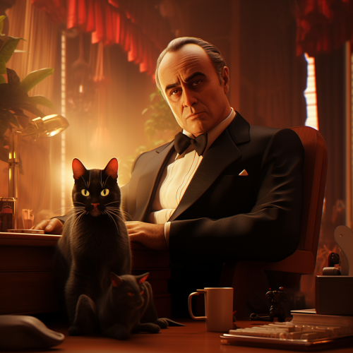 Marlon Brando as the Godfather as a realistic 3D animated character, Wearing black tux, sitting at his desk, cat in lap.
