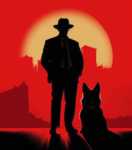 a comic silhouette of a german shepherd dog. The dog should be wearing a porkpie hat and holding a leash while looking to the right of the frame. The image should be in the godfather mafia motif. The background should be red-v 6.0 --ar 120:137