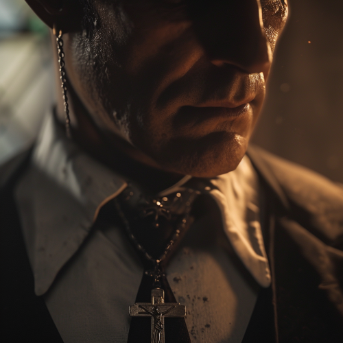 scene from a godfather mafia adventure game, cross around the neck, close-up, unreal engine 5 --v 6.0