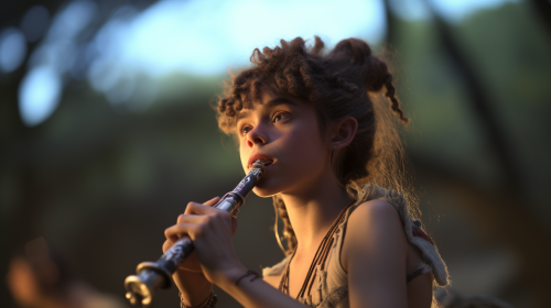 photorealistic movie still of grimes as a cute faun dancing and playing pan flute in a twilight lit fey forest town, UHD 4K, ultrarealism, cinematic lighting, photorealism --ar 16:9 --v 5.2
