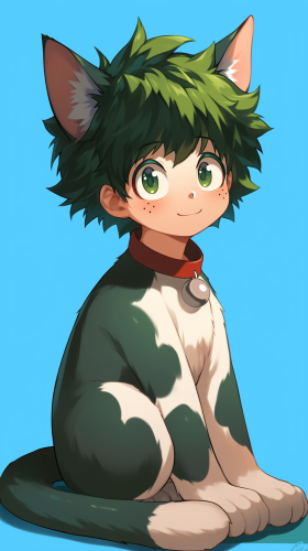 Create an image of Izuku Midoriya from 'My Hero Academia' reimagined as a cat. The cat should have green fur with black spots. The cat's expression should be determined yet kind, capturing Midoriya's hardworking and compassionate nature. The background should be simple, focusing on the cat's heroic and dedicated personality. The art style should be anime-inspired, bringing out Midoriya's essence in a cute, feline form. --ar 9:16 --niji 6