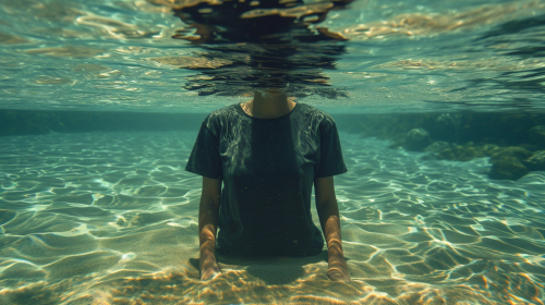 fashion show of black oversize T-shirts underwater in a swimming pool , --ar 16:9 --v 6.0 --s 750 --style raw