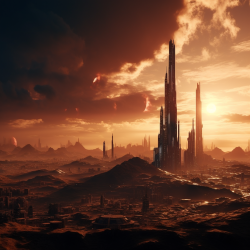 Cinematic photo of a futuristic Mars. Tall buildings, golden hour sun and voluminous clouds create a dramatic scene. 4k, ultra realistic