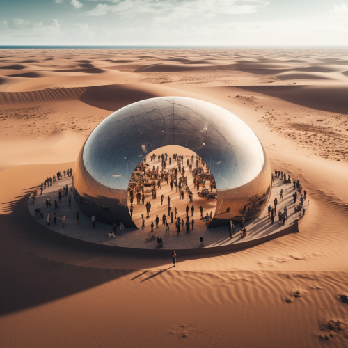 Une photo ultra réaliste d'une plage de sable fin sur la planète Mars avec des touristes qui bronzent sur des transats à l'intérieur d'un dome avec une plage artificielle.