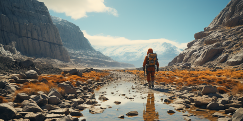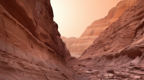 wide view from bottom of mars canyon, rugged, distant canyon walls, bright sunlight, sharp shadows, pink sky, rocky, photorealistic, serious grit, dusty sky, mars rover, rocky canyon, distant hills, --ar 16:9 --no clouds, blue sky