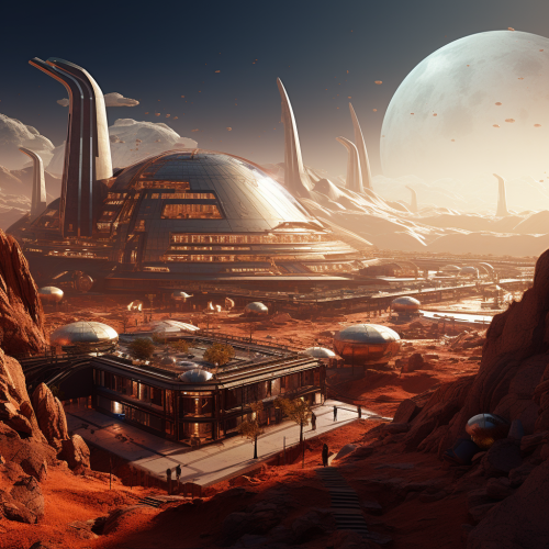 city on the mars, with a huge glass, buildings, humans, roads, trees and humans
