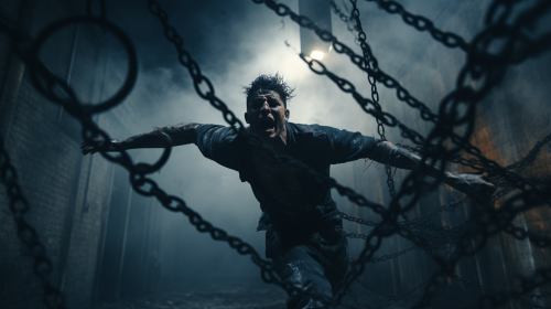 closeup of the face of a man trying to extract himself from a stack of cars, closeup, topshot, high definition, DOF, 8K, color grade, huge ligthing, huge render, photorealistic, cinematographic, high detailed, color palette is bright and warm, anamorphic