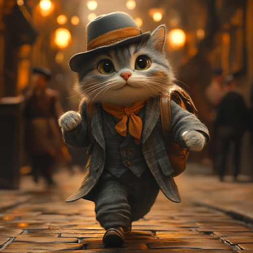 A clever grey cat with a time-traveling backpack, journeying to the Roaring Twenties, dancing in a jazz club, full body, 3D, Pixar style, cartoon. --s 750
