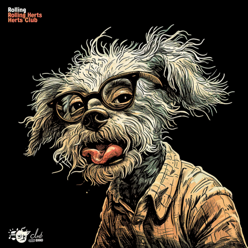 einstein as a dog, concept art logo by R Crumb , big character "Rolling Herts Club BAND", blackground is black --v 6.0