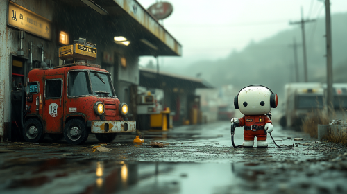 shot of anthropomorphic white mashmellow wears headphone, he has white round hand . he works as gas station worker at the gas station to fuel the gas. he is fueling to the car. shot close up to the gas hose handler to fuel the robot beside --ar 16:9 --v 6.1