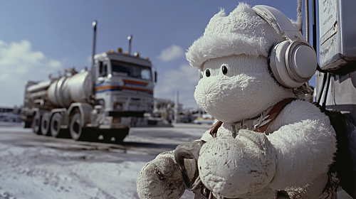 cinematic photo from 1980, shot of anthropomorphic white mashmellow wears headphone, he has white round hand . he works as gas station worker at the gas station to fuel the gas, he is fueling the a big truck. --c 30 --v 6.1 --ar 16:9