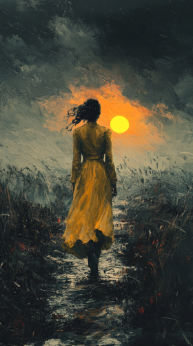 Aisha Tyler walking through a stormy landscape with determination, symbolizing persistence despite challenges, with a rising sun in the distance, representing hope and success. --ar 9:16 --s 250 --v 6.1