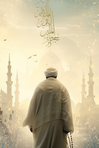 A Turkish imam seen from behind, walking toward a glowing, white horizon where the silhouette of a mosque meets the outlines of a German city. The bright background is mostly white, with hints of gold and pale blue softly fading into each other. Subtle Quranic motifs float in the sky, and the imam’s prayer beads gently glow in his hand. The title is simple and modern, with Arabic calligraphy blending into the design --ar 2:3 --v 6.0