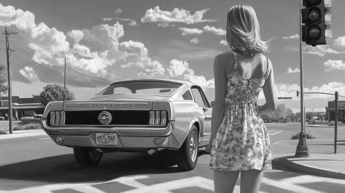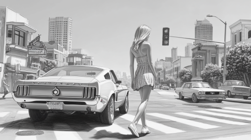 storyboard illustration wide shot of an attractive blonde woman in a summer dress and sneakers walking across the street towards us with a cool retro mustang in profile waiting at the traffic light, woman facing us, car in profile, city block, concept art, storyboard, black and white, pencil drawing, --ar 16:9 --v 6.1