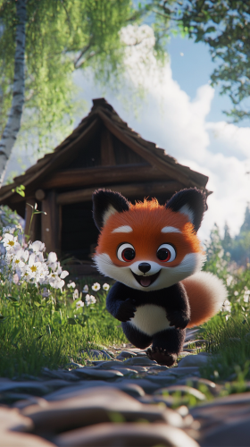 The little fox runs excitedly towards a small house, and the adorable panda, round and plump with black and white fur and big dark circles under its eyes follows behind, in the style of Pixar 8K HD --ar 9:16