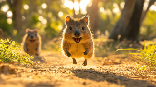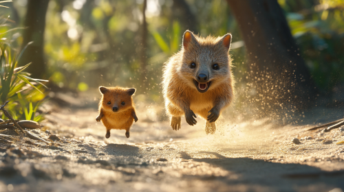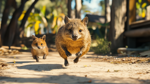 Quokka mother running towards the camera and abandoning her baby behind her. The baby is left behind facing a fox. The fox approach the baby for eating it. Photorealistic, sunny and tropical atmosphere --ar 16:9