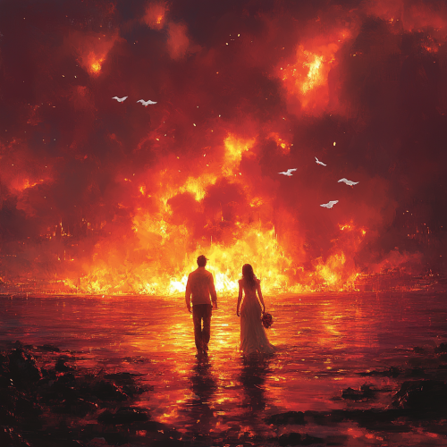 A young couple, a man and woman, walking towards a massive fire in the middle of a burning sea during a misty sunset. Huge flames rise above the water, with pink and red smoke billowing from the fire. White doves fly in the air, blending love and danger themes. The scene has a grainy film effect, with hyper-realistic reflections on the water, capturing a love and dark aesthetic --s 750