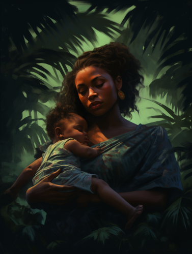 a black woman from buenaventura colombian, with a baby in hands, behind them theres a devil lurking in the dark, dark atmosphere, illustration, tropical forest landscape --ar 3:4