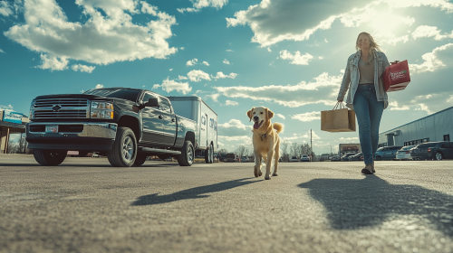Low angle shot following behind a dog in a Tractor Supply Store parking lot as it walks towards a new pickup truck on a bright beautiful day. There is a woman pushing a shopping cart behind the dog following it. The upbeat scene is captured in a commercial ad style photography, with a wide shot and cinematic feel. --ar 16:9