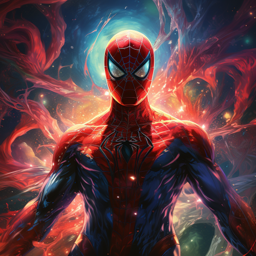 create a gothic image of Spiderman in the style of Art nouveau and alphonse mucha, crimson, Gold, Silver, webs around the border, male subject, vector, sticker