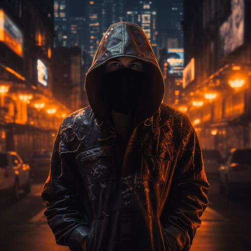 A man in a mask that's gray with a gray hood covering the head and face with blue stripes. The man has body armor made from steel plates, gray tactical vest with pouches, knife holster with a knife in it and gun holsters with guns in them and red stripes, a utility belt around the waist and two large pistols on the thighs in holsters. Gray Compression shirt with blue stripes that has pouches on the arms. The background is a dark city street. --v 6.1