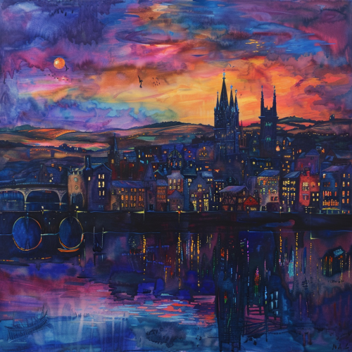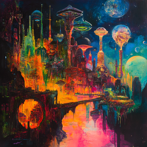 a Simon bisley style painting of a surrealist looking colorful, futuristic city that looks like a psychedelic light show, built by inter-dimensional beings