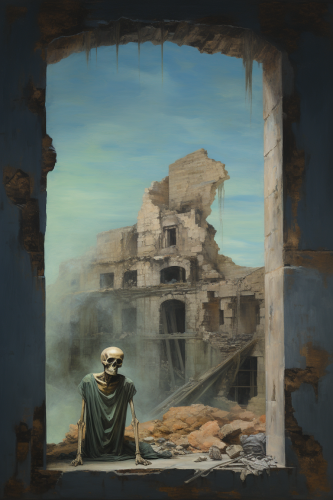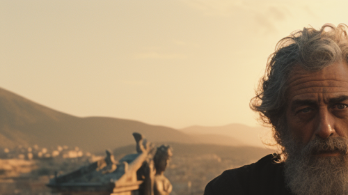 Antic philosopher strong god poses, Cinematic shot by Roger Deakins, dystopian Ancient Greek scenery, shot on Yashica T4 35mm with fujifilm superia x - tra 400. Blade Runner style. light leaks, film look, film grain, high resolution, hyper realistic --ar 16:9