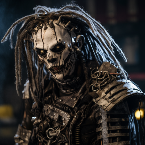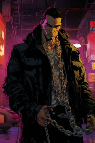man wearing a black tracksuit with a chain wrapped around one arm, neon lights in the background, in the style of Todd Mcfarlane --ar 2:3