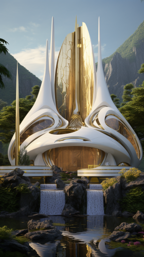 futuristic house in waterfall by todd blake by todd blake, in the style of futuristic sci-fi aesthetic, white and gold, harmony with nature, i can't believe how beautiful this is, futuristic organic, asian-inspired, 32k uhd --ar 9:16