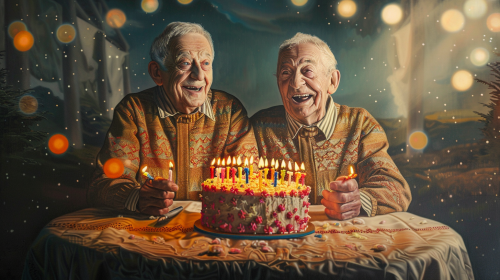 fine art ultra-hyper-realistic masterpiece portrait oil painting by John George Brown of the two oldest happiest identical twin men in the world celebrating their birthday with a birthday cake with hundreds of lit candles, rustic scenery backdrop, bright loop lighting, superb bokeh --ar 16:9 --no hands