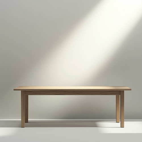 3D render of a white, a wood table in front of camera and a spotlight shining on it, set against a simple, light grey background with soft lighting, in a minimalistic style