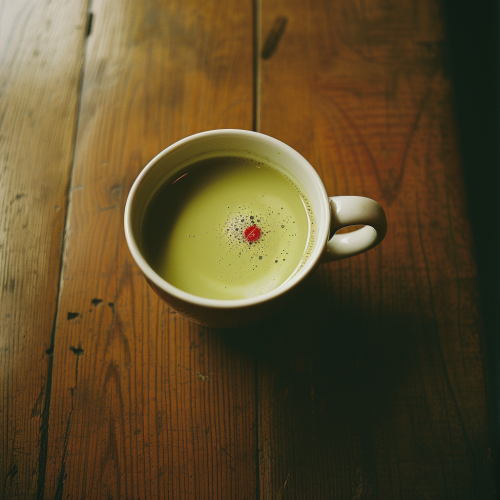 STYLE: Close-up Shot Top view | EMOTION: Tempting I SCENE:Iced Matcha Latte CUP | TAGS: High-end food photography, clean composition, dramatic lighting, luxurious, elegant, mouth-watering, indulgent, gourmet | CAMERA: Nikon Z7 | FOCAL LENGTH: 50mm | SHOT TYPE: Close-up | COMPOSITION: Top view Centered | LIGHTING: Soft directional light | PRODUCTION: Food Stylist --ar 3:2
