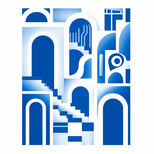 matisse inspired cut-out graphic of architectural feature in electric blue on white background
