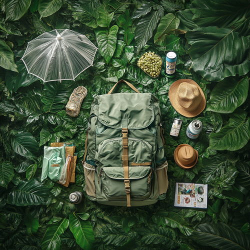 Traveler’s backpack with essential items visible: small umbrella, rain poncho, reusable water bottle, light jacket, travel guide, and snacks, surrounded by lush green Jeju foliage, realistic and inviting
