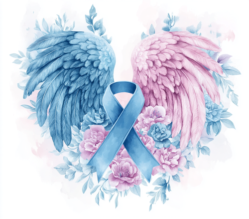 Soft pink and soft blue cancer ribbon with blue and pink angel wings and flowers with foliage in the background, highly-resolution, high quality, hyperrealistic digital airbrush, high detail and definition, watercolor botanical art style, hyper-fine lines --ar 93:82 --v 6.1