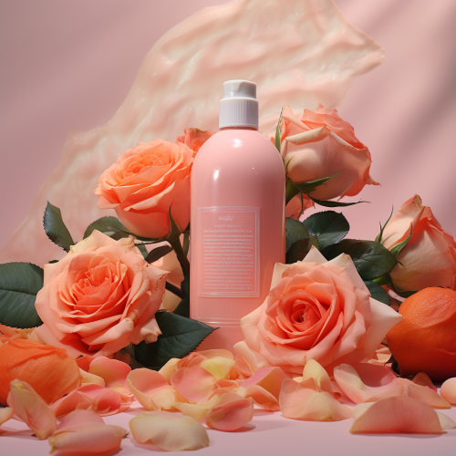 a bottle of lotion and pink roses set up, in the style of mass-produced objects, expert draftsmanship, clamp, texture-rich, infused with social commentary, nature-based patterns, light pink and light orange,Best quality, masterpiece, ultra high res, (photorealistic:1.4), raw photo, 8k raw photo