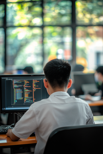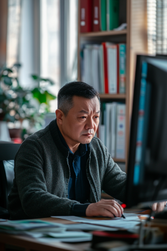 A Chinese teacher does the desk, facing the monitor office, shooting from the oblique rear, the camera focus on the screen, the teacher oblique side to the camera lens, professional atmosphere, depth of field, SONY α9 III --ar 2:3 --style raw --v 6.1