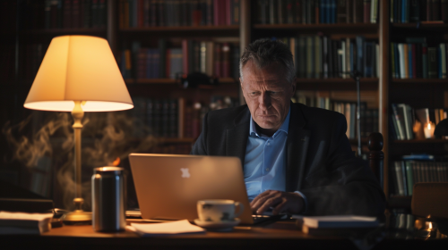 A very elegant man in his 60s with short, graying hair and no beard is sitting at a desk in a dark office. He is wearing a black suit and a blue shirt, with no tie. He is in front of a laptop, concentrating on his work. On one side of the desk is a lamp that softly illuminates the scene, creating an intimate and focused atmosphere. On the other side of the desk, a thermos and a steaming cup of coffee are visible. Behind him, in the back of the office, is a library full of books, adding an intellectual touch to the environment. too much realism HD --ar 16:9 --v 6.0
