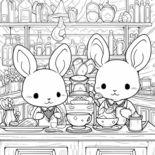 Thick line, hand drawn, children’s coloring book, black and white, cell shaded, cute, chibi, bunnies cleaning and working as baristas in the interior of a magical coffee shop, fun, simplistic, meant for coloring --niji 5